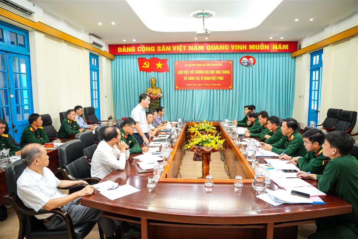 Chiều ngày 13/11/2025, tại Trường Đại học Nha Trang đã diễn ra buổi làm việc giữa Bộ Chỉ huy Quân sự (CHQS) tỉnh Khánh Hòa và Nhà trường về công tác sĩ quan biệt phái đang thực hiện nhiệm vụ tại Trung tâm Giáo dục quốc phòng và an ninh. Buổi làm việc được tổ chức nhằm cụ thể hóa kết luận của Ban Thường vụ Đảng ủy Quân sự tỉnh tại phiên họp ngày 29/10/2025, hướng tới tăng cường hiệu quả phối hợp giữa hai đơn vị trong thời gian tới.