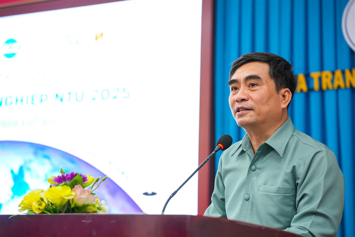 GS.TS. Phạm Quốc Hùng – Phó Hiệu trưởng Trường Đại học Nha Trang phát biểu tại Lễ tổng kết và trao giải Cuộc thi Ý tưởng Khởi nghiệp NTU 2025, khẳng định vai trò của sinh viên trong hệ sinh thái đổi mới sáng tạo và phát triển bền vững.