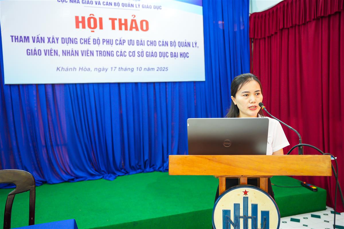 Tại hội nghị, Trường Đại học Nha Trang báo cáo thực trạng chế độ tiền lương và các khoản phụ cấp đang áp dụng cho cán bộ quản lý, giáo viên và nhân viên trong Trường, đồng thời nêu rõ những khó khăn, bất cập và đề xuất giải pháp phù hợp với điều kiện thực tế của nhà trường và hệ thống giáo dục đại học. Đây là cơ hội để Nhà trường góp tiếng nói thực tiễn trong quá trình xây dựng chính sách mới, góp phần đảm bảo quyền lợi, thu hút và giữ chân đội ngũ nhà giáo, nhân viên giáo dục có chất lượng.