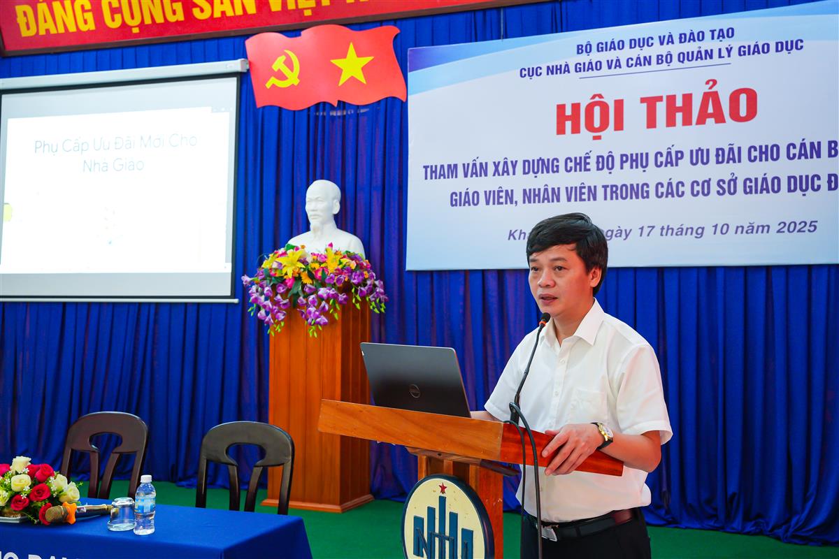 Ngày 17/10/2025, tại Trường Đại học Nha Trang, Cục Nhà giáo và Cán bộ quản lý giáo dục (Bộ Giáo dục và Đào tạo) tổ chức Hội nghị tham vấn xây dựng chế độ phụ cấp ưu đãi cho cán bộ quản lý, giảng viên và nhân viên trong các cơ sở giáo dục đại học khi thực hiện chính sách tiền lương mới.