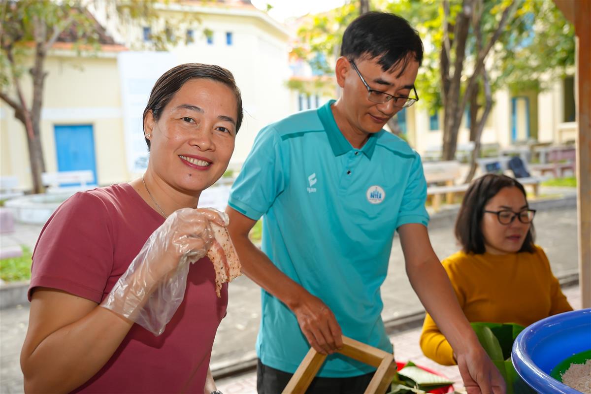 Điểm nhấn của chương trình là hoạt động gói bánh chưng xanh, được tổ chức xuyên suốt trong ngày 08/02/2026. Gần 500 chiếc bánh chưng đã được các cán bộ, giảng viên, viên chức và người lao động cùng nhau chuẩn bị, gói ghém cẩn thận, gửi gắm trong đó tinh thần sẻ chia, gắn kết và nét đẹp văn hóa truyền thống của dân tộc. Những chiếc bánh không chỉ mang giá trị vật chất mà còn là món quà tinh thần ý nghĩa, góp phần mang đến một cái Tết đủ đầy, ấm áp cho tập thể Nhà trường.