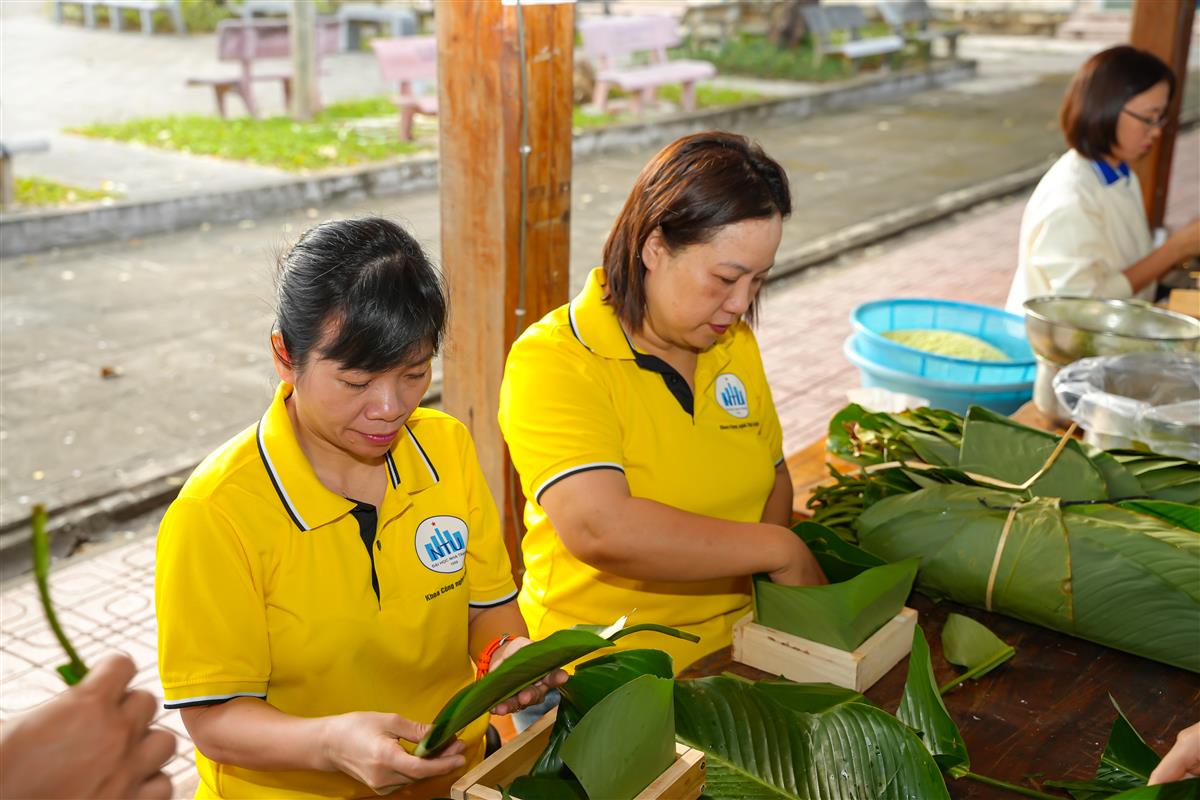 Viên chức, người lao động Trường Đại học Nha Trang cùng tham gia gói bánh chưng xanh, góp phần lan tỏa không khí Tết ấm áp, nghĩa tình trong toàn trường.