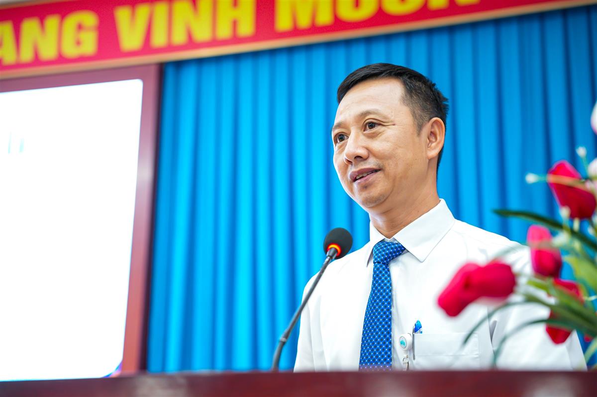 TS. Trần Doãn Hùng – Phó Hiệu trưởng Nhà trường phát biểu tại lễ trao học bổng "Ánh đèn Vân Phong", ghi nhận sự đồng hành của Công ty TNHH Điện lực Vân Phong trong hỗ trợ sinh viên.