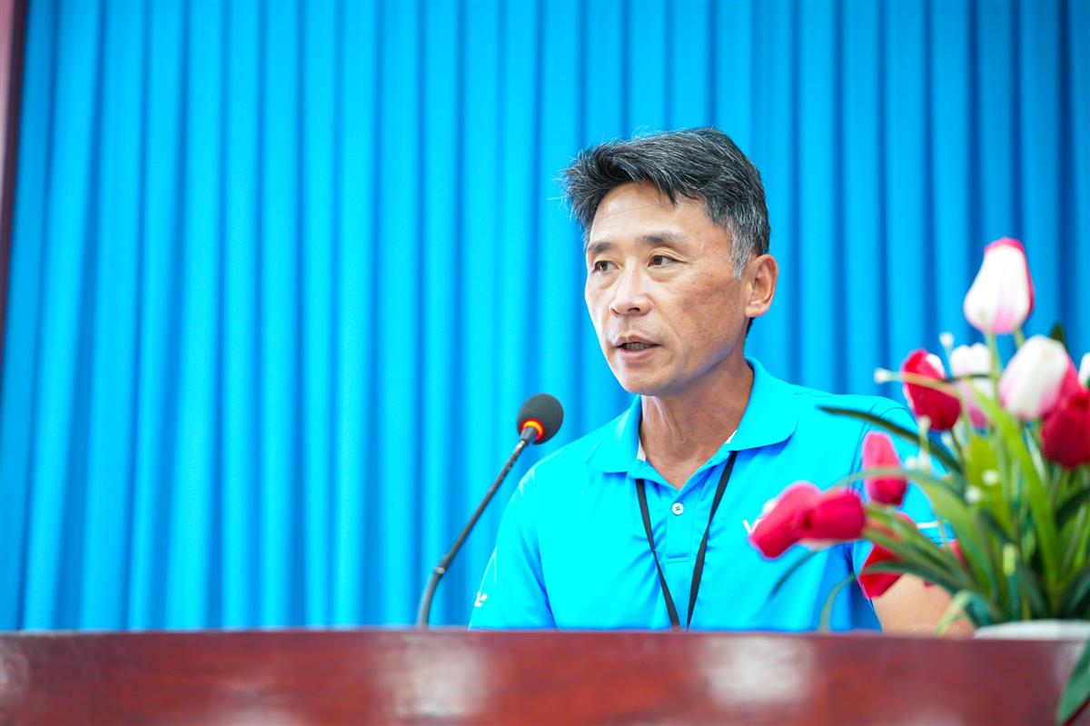 Ông Kenji Koike – Giám đốc Nhà máy Nhiệt điện Vân Phong 1 phát biểu tại lễ trao học bổng, chia sẻ về cam kết đồng hành cùng Trường Đại học Nha Trang trong các hoạt động hỗ trợ sinh viên và phát triển nguồn nhân lực chất lượng cao.